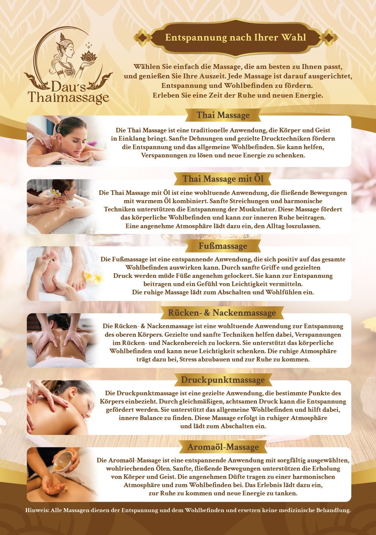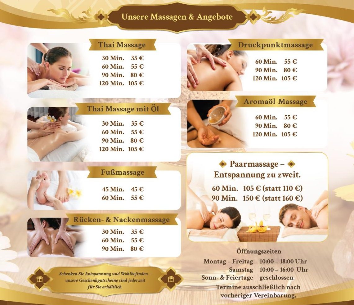 Hinweis: Wir bieten seriöse Thaimassagen an, und bitten darum, von der Nachfrage nach Erotik-Massagen abzusehen.